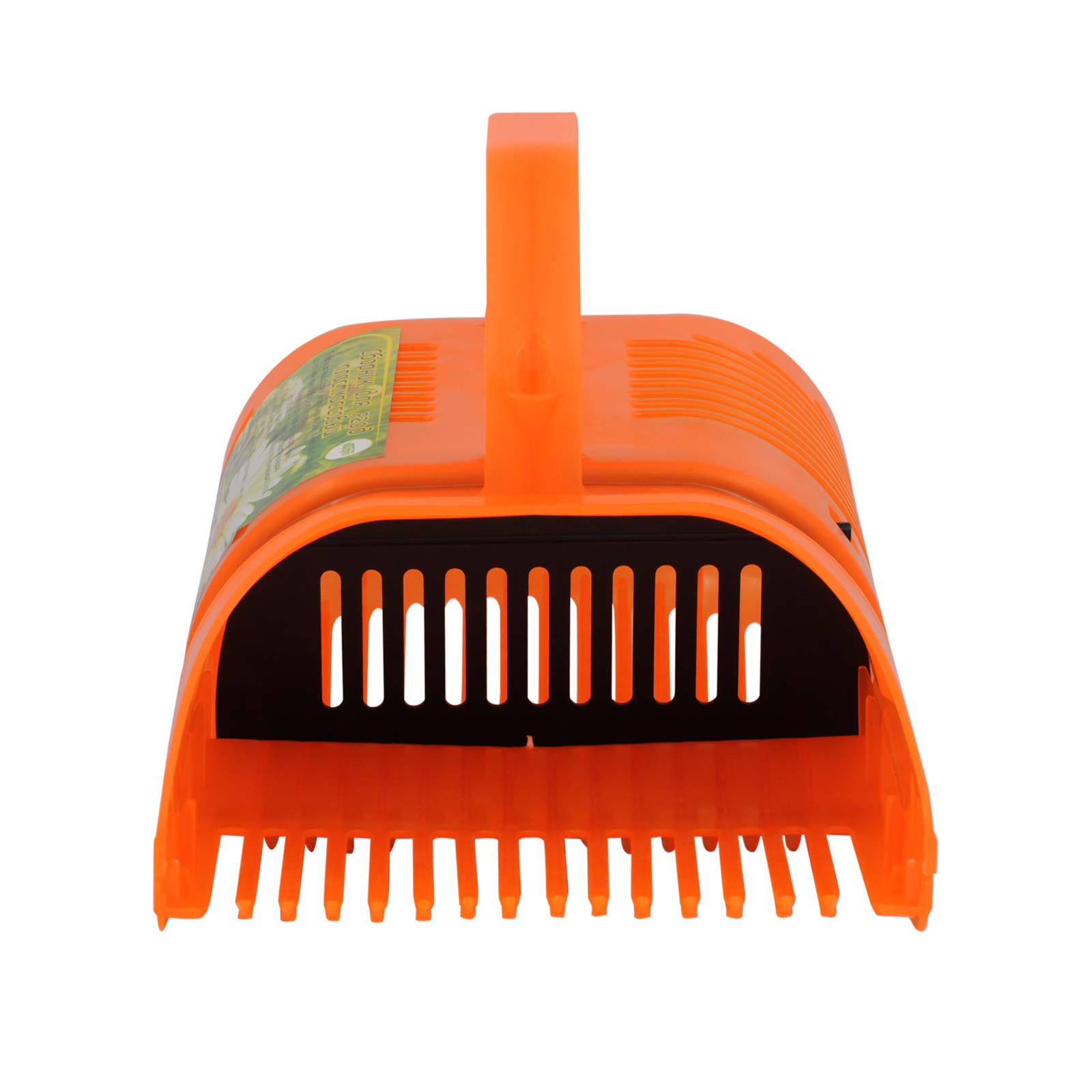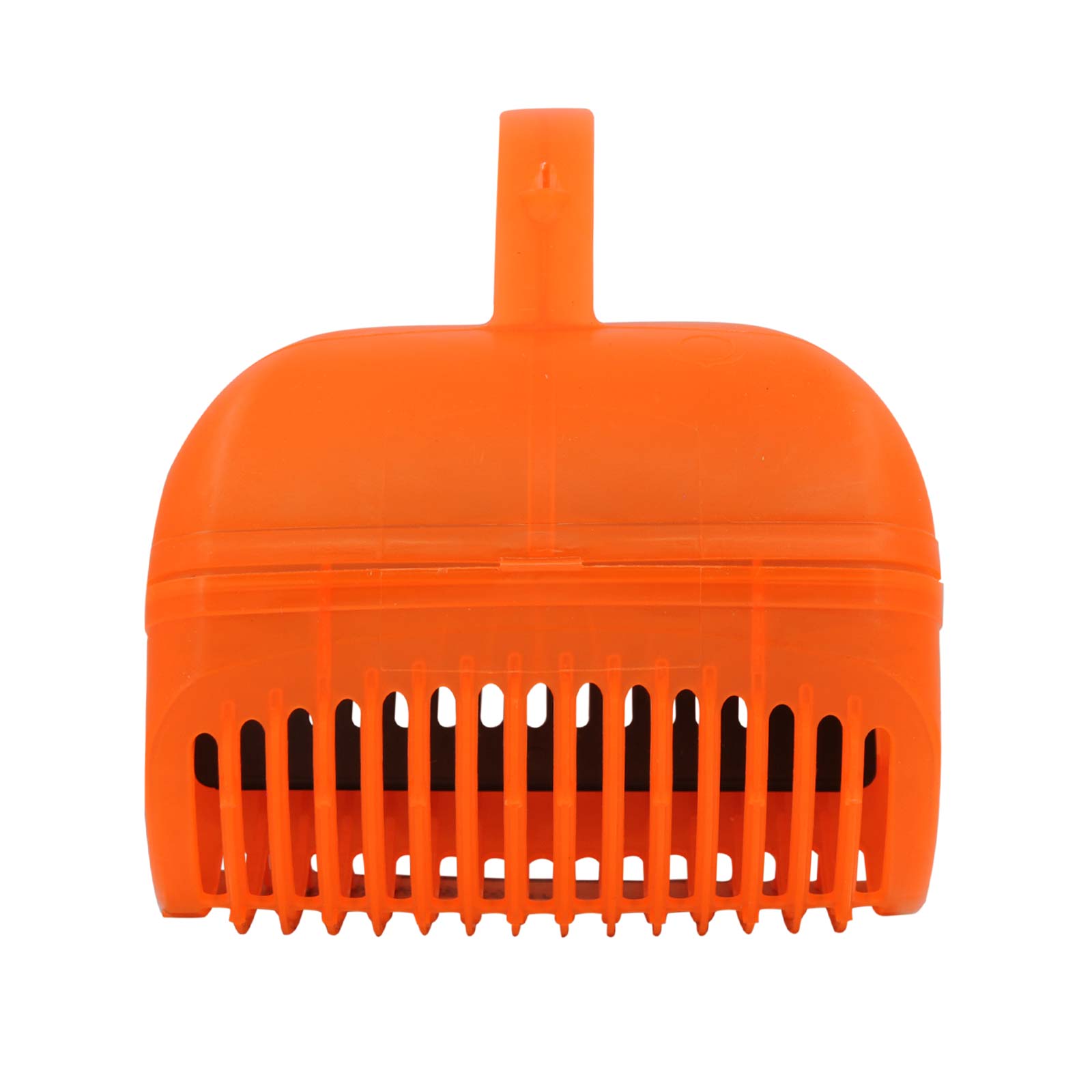 Удобная ручка позволяет легко и быстро собирать ягоды, а заслонка препятствует попаданию крупного мусора и выпадению ягод из него.