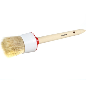 Кисть круглая с натуральной щетиной. Бандаж выполнен из пластика. Деревянная неокрашенная ручка
