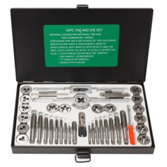 Набор метчиков и плашек метрический 40пр. (М3х0.5/0.6, М4х0.7/0.75, М5х0.8/0.9, М6х0.75/1, М7х0.75/1,М8х1/1.25, М10х1.25/1.5, М12х1.5/1.75), в металли