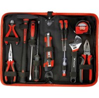 В комплект входят длинногубцы, отвертка-тестер, пассатижи, молоток слесарный 200 г, отвертки SL 6 х 150 мм, РН 2 х 150 мм, две часовые отвертки: 2 х 50 мм, РН 00 х 50 мм; кусачки мини, ключ разводной, нож технический 18 мм, рулетка 3 м х 13 мм.