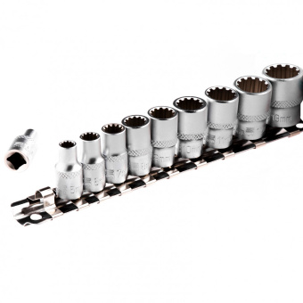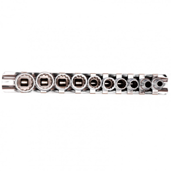 В набор входят торцевые головки с универсальным профилем SPLINE на планке под квадрат 1/4" следующих размеров: