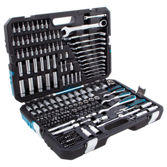 Набор инструментов включает в себя 216 предметов, в том числе ключи-трещотки из стали CrV со 120 зубьями и присоединительным размером 1/4"", 1/2"" и 3/8"".