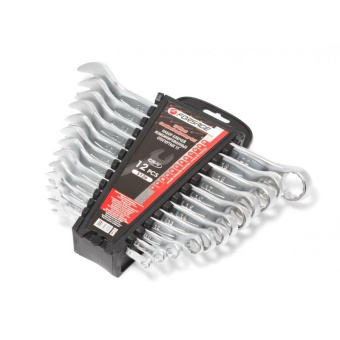 Ключи комбинированные - рожково-накидные, накидная часть с изгибом 15 градусов. Размеры: 6, 8, 10, 12, 13, 14, 15, 16, 17, 18, 19, 22 мм. В пластиковом держателе.