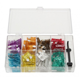 Набор автомобильных предохранителей от 7,5А до 30А. В комплекте 96 штук 6 оттенков: фиолетовый, голубой, оранжевый, желтый, коричневый, белый, красный, зеленый.