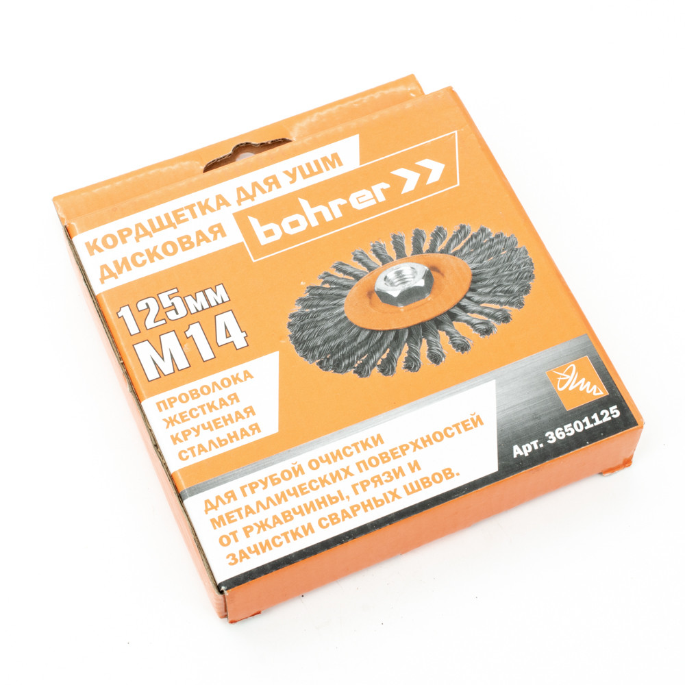 -36501125 Кордщетка Bohrer для УШМ (дисковая, витая жесткая 125мм, толщ. проволоки 0,5 мм, М14)БитыГубцевый инструментДиски, кругиЗаклепочники, степлерыЗубило, ломы, гвоздодерыИзмерительные приборыИзолента,стяжки, зажимные повязкиКлючи, наборы ключейКрепежиМалярный инструментМолотки и кувалдыНаборы инструментовНапильники, рашпили, надфилиРежущий инструментСистема храненияОтвертки, наборы отвертокПилки для лобзиков, ножи для рубанковПлашки, метчики, резцыПрижимные приспособленияСверла и бурыСъемникиТопоры, стамескиШлифование и полированиеШприцы, пистолеты, наборы покрасочныеЭлектропаяльникиНабор насадок для гравераМасленки, нагнетателиСредства защитыЭкстракторы