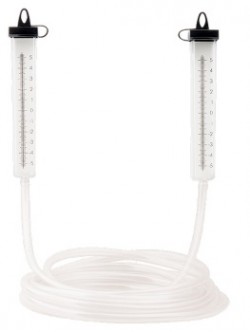 Гидроуровень состоит из двух пластмассовых колб с нанесенной на них шкалой и гибким шлангом, соединяющим колбы между собой.