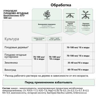 Жидкое биоудобрение для плодово-ягодных культур с комплексом микро- и макроэлементов, аминокислотами и полезными бактериями.