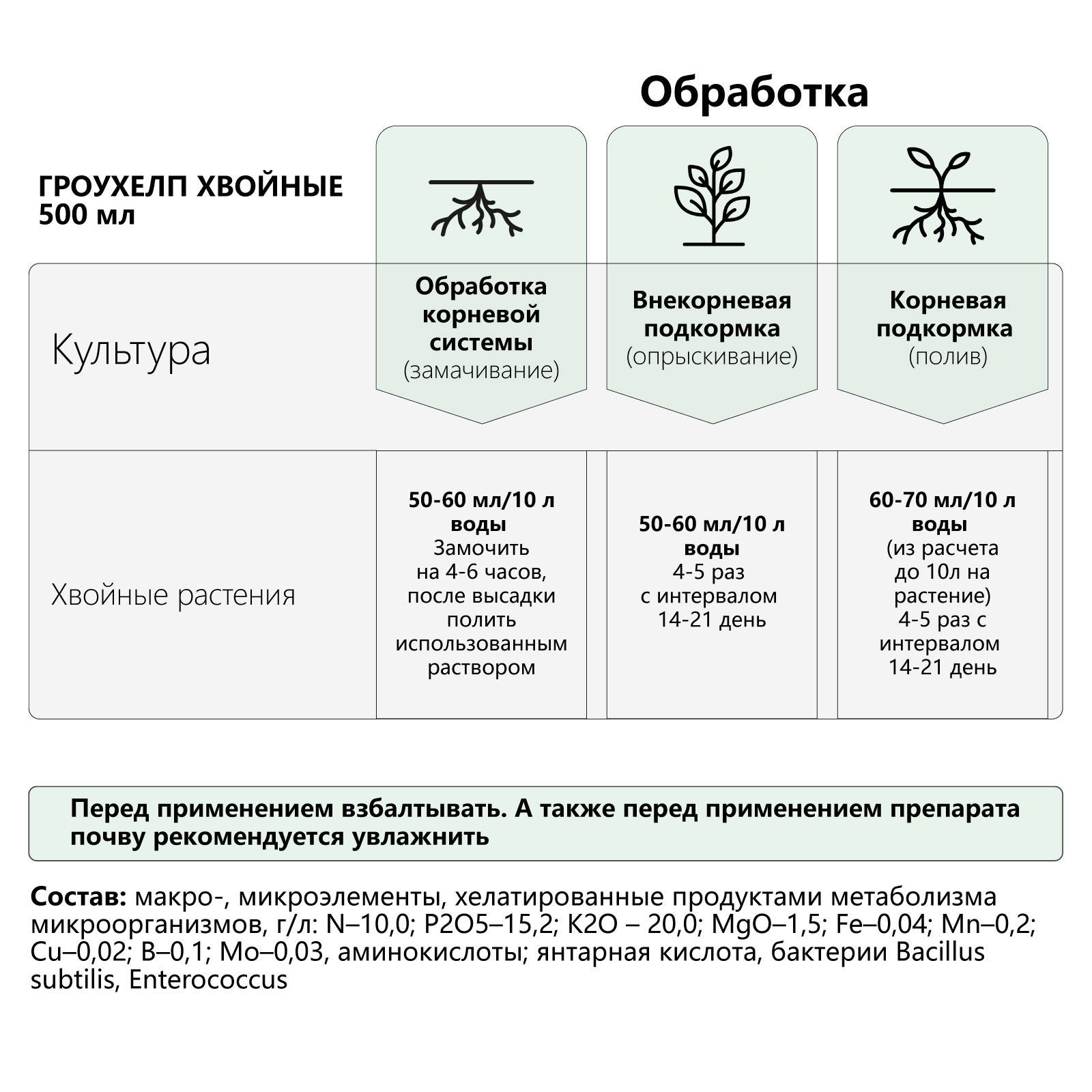 Жидкое биоудобрение для хвойных растений с комплексом микро- и макроэлементов, аминокислотами и полезными бактериями.