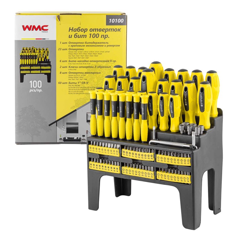 -51782 WMC-10100 Набор отверток и бит WMC TOOLS 100пр.БитыГубцевый инструментДиски, кругиЗаклепочники, степлерыЗубило, ломы, гвоздодерыИзмерительные приборыИзолента,стяжки, зажимные повязкиКлючи, наборы ключейКрепежиМалярный инструментМолотки и кувалдыНаборы инструментовНапильники, рашпили, надфилиРежущий инструментСистема храненияПилки для лобзиков, ножи для рубанковПлашки, метчики, резцыПрижимные приспособленияСверла и бурыСъемникиТопоры, стамескиЩетки проволочныеШлифование и полированиеШприцы, пистолеты, наборы покрасочныеЭлектропаяльникиНабор насадок для гравераМасленки, нагнетателиСредства защитыЭкстракторы