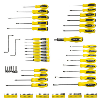 Состав набора: 1 шт. - Отвертка-битодержатель с храповым механизмом и реверсом. 23 шт. - Отвертки: Slotted: 1/8x3", 5/32x4", 3/16 "x3", 3/16 "x4", 1/4 "x4", 1/4 "x6", 5/16 "x6" Phillips: PH0x3", PH1*3", PH1x4", PH1x6", PH2x4", PH2x6" Star: T8x3", T10x3", T15x3", T20x3", T25x4", T30x4" Square: S0x3", S1x3", S2x4", S3x6". 6 шт. - Бита-насадка отверточная 6-гр.:6, 7, 8, 9, 10 мм. 2 шт. - Ключи-отвертки Z-образные: 5-PH1, 6-PH2. 8 шт. - Отвертки ювелирные: Slotted: SL3/32 "x2", SL1/8x2" Phillips: PH00x2", PH0x2" Star: T6x2", T7x2", T8x2", T10x2". 60 шт. - Биты 1"CR-V: PH0, PH1, PH2, PH3 SL1/8-9/64-5/32-11/64-3/16-7/32-1/4-17/64-9/32-5/16; T6-8-10-15-20-25-27-30-35-40;PZ0, PZ1, PZ2, PZ3; S0-1-2-3, H2-2.5-3-4-5-6; H1/16-3/32-7/64-1/8-9/64-5/32-3/16-7/32-1/4-5/16. -