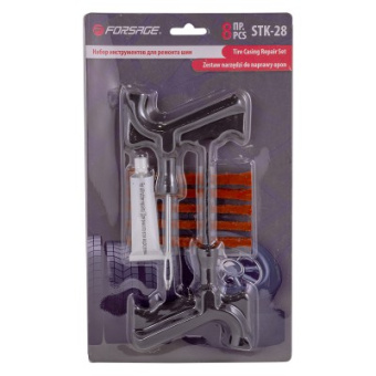НаНабор инструментов для ремонта шин 8предметов, в блистере от бренда Forsage . Набор для ремонта бескамерных шин просто использовать, так что вам даже не необязательно иметь практический опыт по ремонту вашего автомобиля. Ремкомплект обладает всеми необходимыми элементами, которые нужны для быстрой и качественной починки колес. Достоинства использования такого набора – это быстрый и качественный ремонт резины своими руками. Применять такой комплект можно как в гараже, так и в экстренных ситуациях при проколе колеса в пути. Использование такого метода показало, что на выполнение всей работы уходит примерно от 10 до15 минут. После этого колесо можно накачивать воздухом до нужного давления. В виду своей компактности наш набор легко поместиться в бардачке или багажнике, что позволит вам применять его при необходимости даже на дороге. Наш комплект для ремонта резины – это набор инструментов и аксессуаров в составе которого вы найдёте: Рашпиль- специальный инструмент, главная задача которого – создание ровного круглого отверстия на месте прокола колеса. Использование этого приспособления упростит последующий ремонт и латание дыры на покрышке. Шило – острый инструмент, имеющий отверстие в игле. При его помощи вы заклеите дыру в шине автомобиля. Жгут – основной материал, который предназначен для заполнения места прокола. Клей.