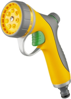 Пистолет-распылитель со штуцерной посадкой и удобным курком, расположенным спереди. Оснащен регулируемой форсункой, что обеспечивает семь режимов полива: двойную плоско-вертикальную струю, жесткую струю, сочащийся режим, двойную плоско-горизонтальную струю, душ, распыление типа «туман», конусное распыление.
