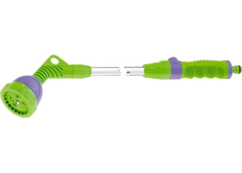 Распылитель удлиненный со штуцерной посадкой. Оснащен регулируемой форсункой, что обеспечивает девять режимов полива: плоско-вертикальную струю, струю под углом, душ, плоско-горизонтальную струю, конусное распыление, центральное распыление, жесткую струю, туман, сочащийся режим.