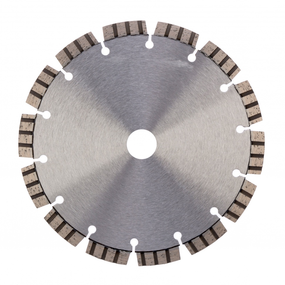 Универсальный алмазный диск ТМ GROSS предназначен для резки материалов: бетон, армированный бетон, кирпич, камень, гранит, шлакоблок, мрамор, тротуарная плитка. Тип диска 1A1RSS Turbo с лазерной приваркой сегментов, обеспечивает наилучшее крепление сегментов, повышая стойкость диска к перегрузкам и перегреву. Режущий сегмент высотой 10 мм, с высокой концентрацией крупных синтетических алмазов 40–50 мкм повышает износостойкость диска и увеличивает скорость реза. Для использования на УШМ (болгарке) соответствующего типоразмера. Сухой рез, без использования водяного охлаждения. Рекомендован для профессионального использования и большого объема работ.