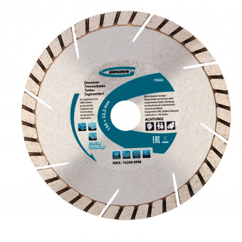 Универсальный алмазный диск ТМ GROSS предназначен для резки материалов: бетон, армированный бетон, кирпич, камень, гранит, шлакоблок, мрамор, тротуарная плитка. Тип диска 1A1RSS Turbo (Турбо-сегментный) совмещает в 1 диске преимущества сегментного и турбированного типа. Режущий сегмент высотой 10 мм.