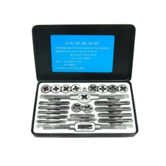 Набор дюймовый метчиков и плашек в металличиском кейсе. Размеры: 1/4NC20; 1/4NF28; 5/16NC18; 5/16NF24; 3/8NC16; 3/8NF24; 7/16NC14; 7/16NF20; 1/2NC13; 1/2NF20; 1/8NPT27. Всего 24 предметов в комплекте.