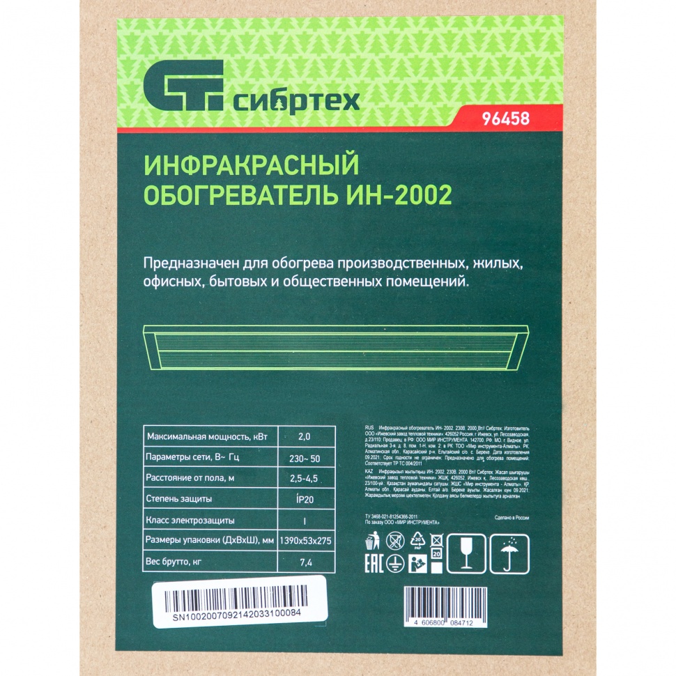 --96458 Обогреватель инфракрасный СИБРТЕХ ИН- 2002, 230В, 2000 ВтСадовая техникаМотоциклыВелосипедыМопедыТехника для ухода за газоном, садомМасла и смазкиЭлектроинструментСтроительный инвентарьСад и ОгородСлесарный и столярный инструментОтопительное оборудованиеЗимний ассортиментСопутствующие товары и расходникиЗапчасти к садовой техникеТовары для домаАвтотоварыУцененный товар