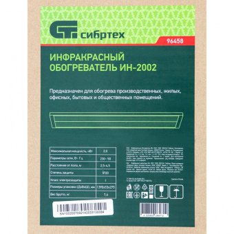 96458 Обогреватель инфракрасный СИБРТЕХ ИН- 2002, 230В, 2000 Вт