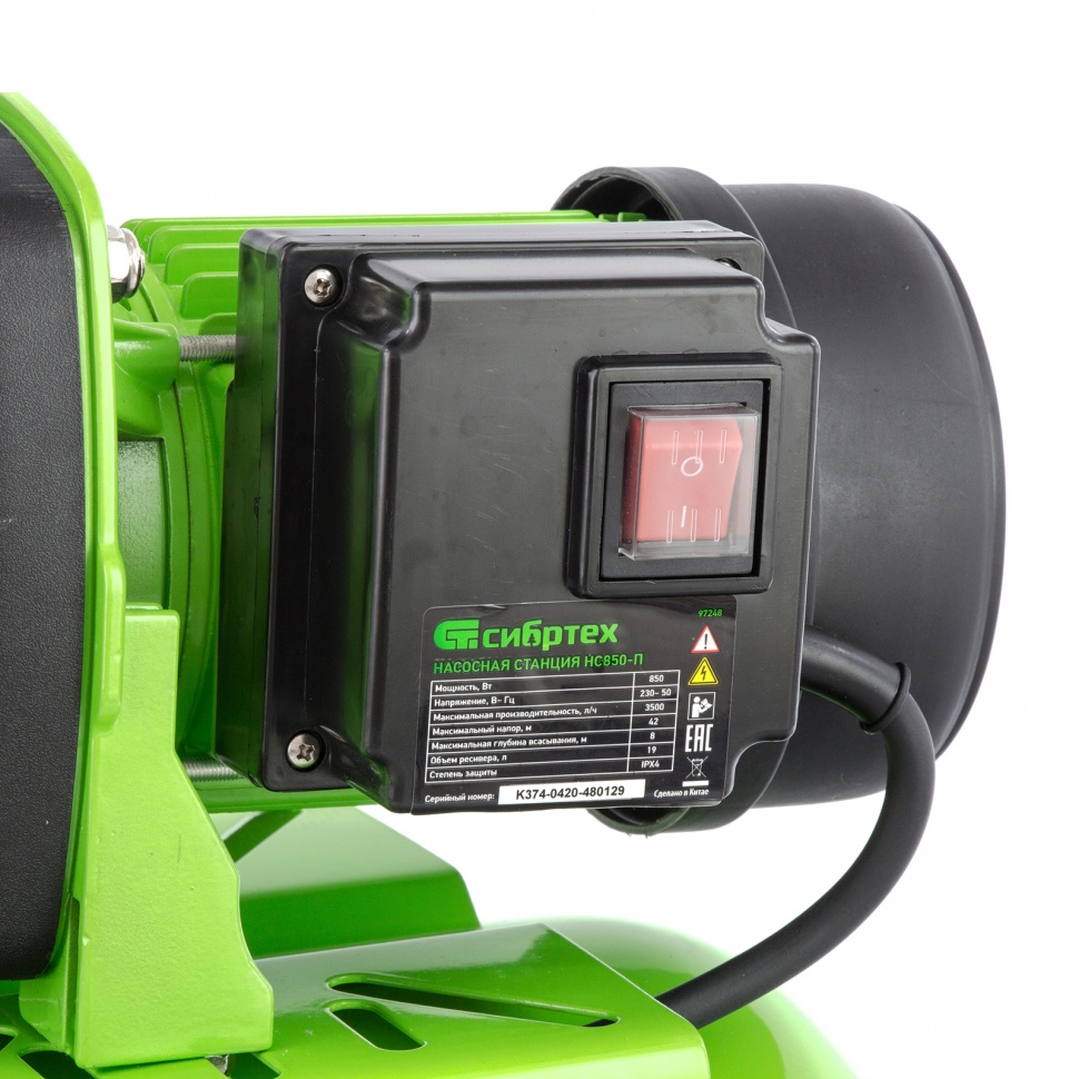 Насосная станция Сибртех НС850-П 97248 мощностью 850 Вт, с ресивером на 19 л, работает со скоростью 3500 л/ч и обеспечивает напор до 42 м. Используется для обеспечения подачи воды в загородных домах, поддержания давления в системе водоснабжения квартир.