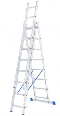 Универсальная лестница трехсекционная может использоваться и как стремянка, и как раздвижная лестница. Две высокопрочные ленты и распорки с фиксацией служат для придания устойчивости опоре. Концы стойки с ножками лестницы предотвращают скольжение.