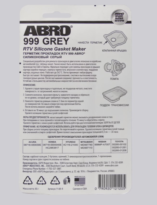 ABRO Герметик силиконовый серый (999) 85г (9-AB)