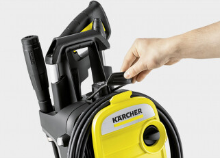 Шланг высокого давления легко наматывается на корпус аппарата и закрепляется благодаря резиновому фиксатором.