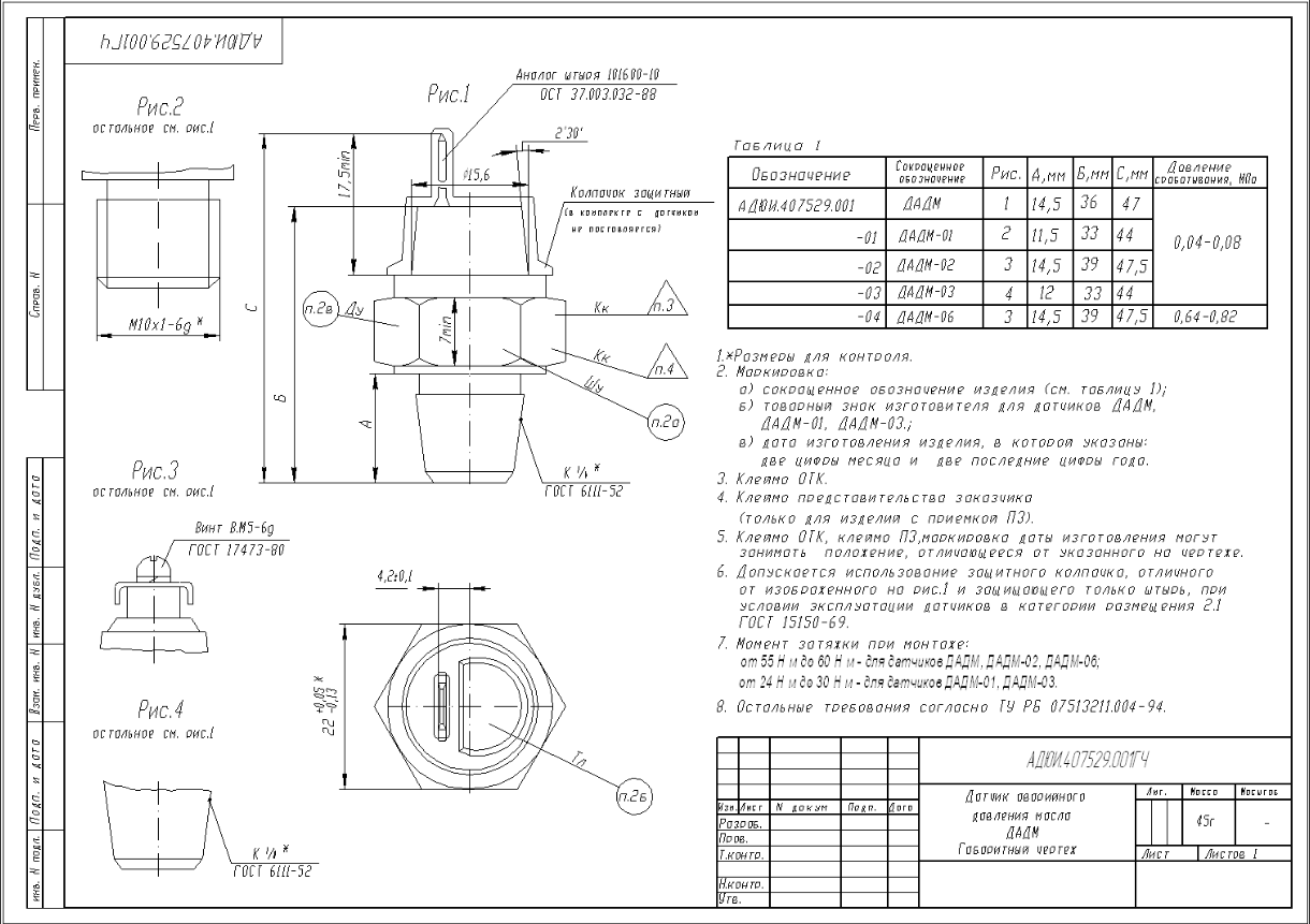Датчик ДАДМ-03. Давление, (кГс/см²): размыкание от 0,4 до 0,8, замыкание от 0,8 до 0,4. Состояние цепи при отстутствии давления - замкнута. Подключение к сети - штырь 101600-10. Резьба на корпусе К1/8''