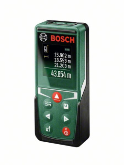 Дальномер Universal Distance 50 BOSCH применяется для прямого и косвенного (по теореме Пифагора) измерения расстояний. Дополнительными возможностями прибора являются вычисление площади и объема, возможность сложения или вычитания измеренных величин. Для экономии батареек предусматривается автоматическое отключение модели при бездействии продолжительностью 5 минут.