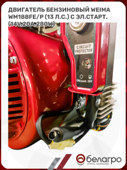 Бензиновый двигатель WM188FE/P-2 – аналог японского Honda CX390. Работа 4-хтактного двигателя сопровождается более низким уровнем шума, экономичностью и экологичностью по сравнению с 2-хтактным. Аппарат оснащен электростартером, который облегчает и ускоряет запуск техники.