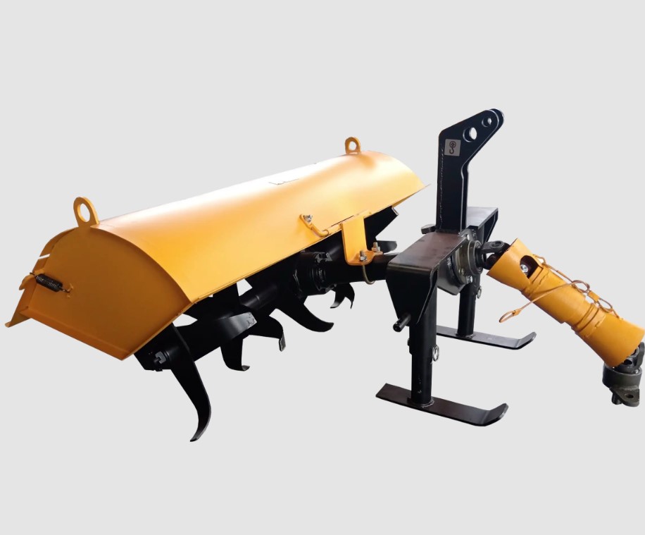Фреза агрегатируется через карданный вал и кронштейн с ВОМ и рычагами навесного устройства мини-трактора.
