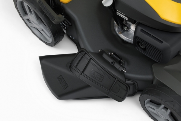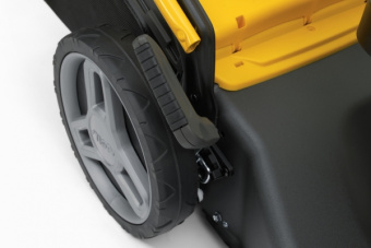 Большие задние колеса позволяют легко маневрировать на пересеченной местности. Боковой дефлектор и заглушка для мульчирования входят в комплект.