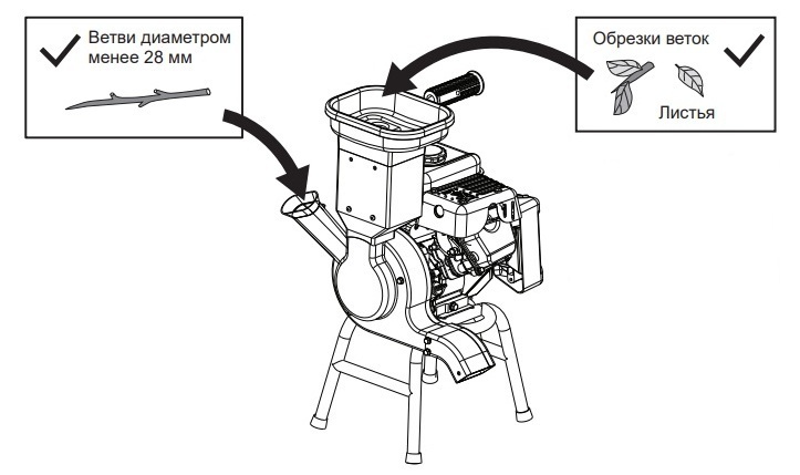 ВНИМАНИЕ!!! Агрегат предназначен для перереботки свежеспиленных или срубленных веток, деревьев и прочей растительности. Измельчение старых или высохших веток может привезти к быстрому затуплению режущих ножей.