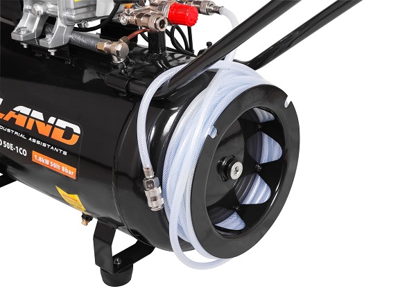 В комплекте с компрессором идет армированный воздушный шланг 10 метров вместе с быстросъемами. На торце компрессора смонтировано устройство для намотки шланга.