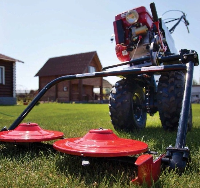 Роторная косилка является одним из ходовых навесных приспособлений к мотоблоку и предназначена для скашивания как обычной травы, так и зерновых культур с высотой до 1 м.