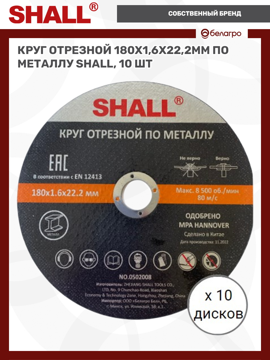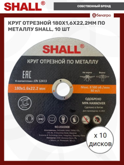 Круг отрезной 180х1,6х22,2мм по металлу SHALL, 10 шт