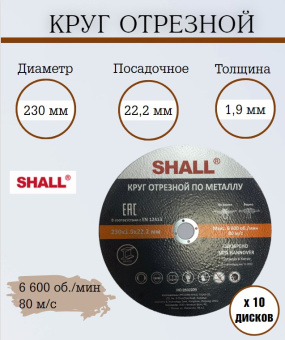 Круг отрезной 230х1,9х22,2мм по металлу SHALL, 10 шт