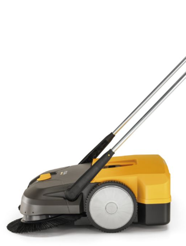 Она оснащена щетками дискового типа. Положение щеток может меняться. Например, оператор может настроить машину на плотное прилегание щеток к поверхности для уборки мелкой пыли и грязи. Рукоятка складного типа для удобного хранения.