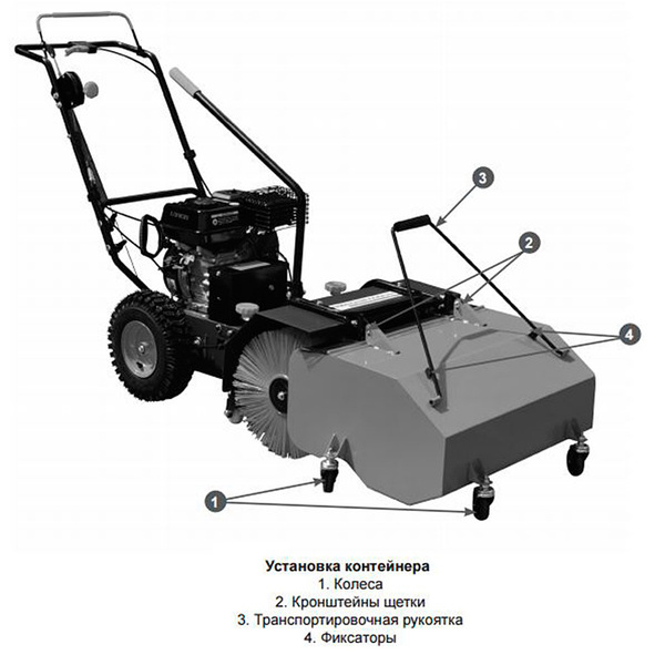 Отвал, контейнер для сбора мусора и снегоуборщик в комплект поставки не входят и приобретаются отдельно.