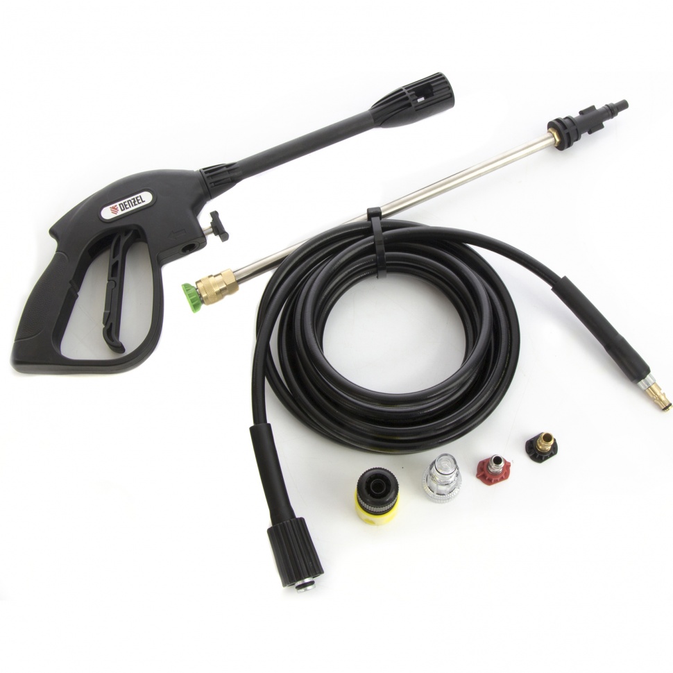 Моечная машина DENZEL R-165 предназначена для мойки поверхностей бесконтактным методом под высоким давлением.При потребляемой мощности 2,2 кВт моечная машина нагнетает давление до 165 бар, при этом расход воды составляет 7 л/мин.Моечная машина может быть подключена к водопроводной системе или использовать воду из накопительного резервуара. Модель комплектуется шлангом высокого давления длиной 5 м, имеет ручку и колеса для удобного перемещения. Оснащается металлическим пистолетом и быстросменными форсунками.