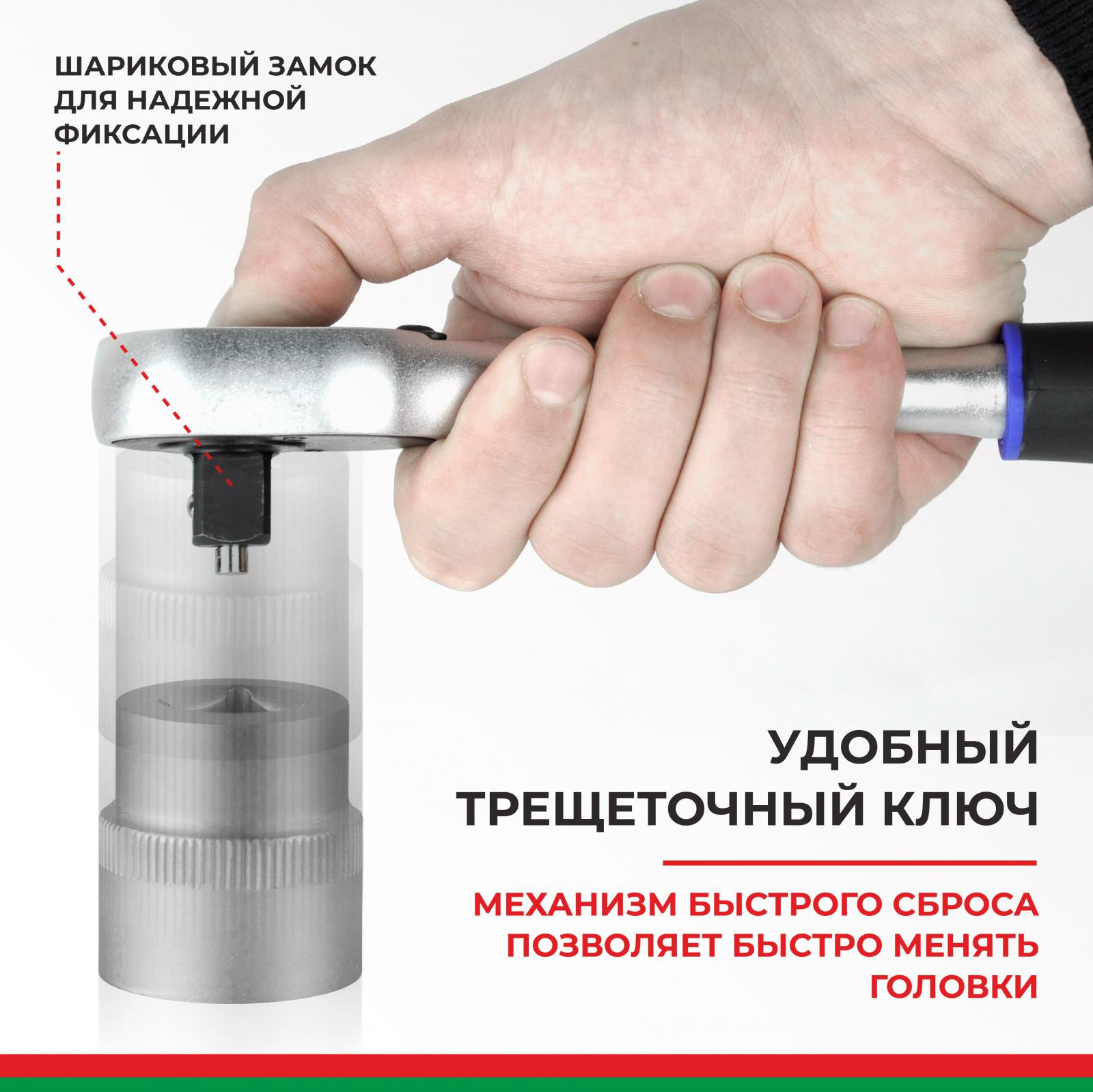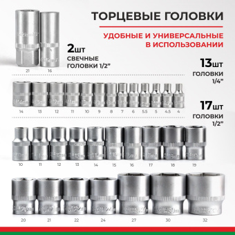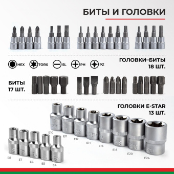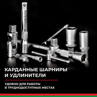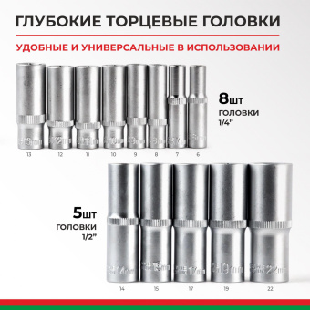 Прочные металлические замки и эргономичный ударопрочный кейс чемодан, делают набор головок с трещоткой эффективным и мобильным.