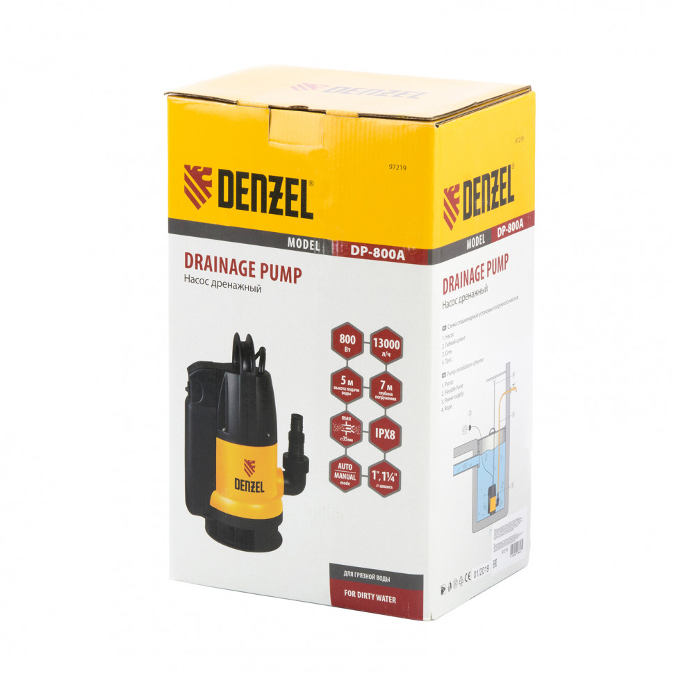 Дренажный насос Denzel DP800A 800 Вт эффективно справляется с откачкой сильнозагрязненной воды с частицами до 35 мм при осушении затопленных помещений, колодцев и сточных канав. Так же подходит для подачи чистой воды из колодцев и резервуаров или для организации системы полива.