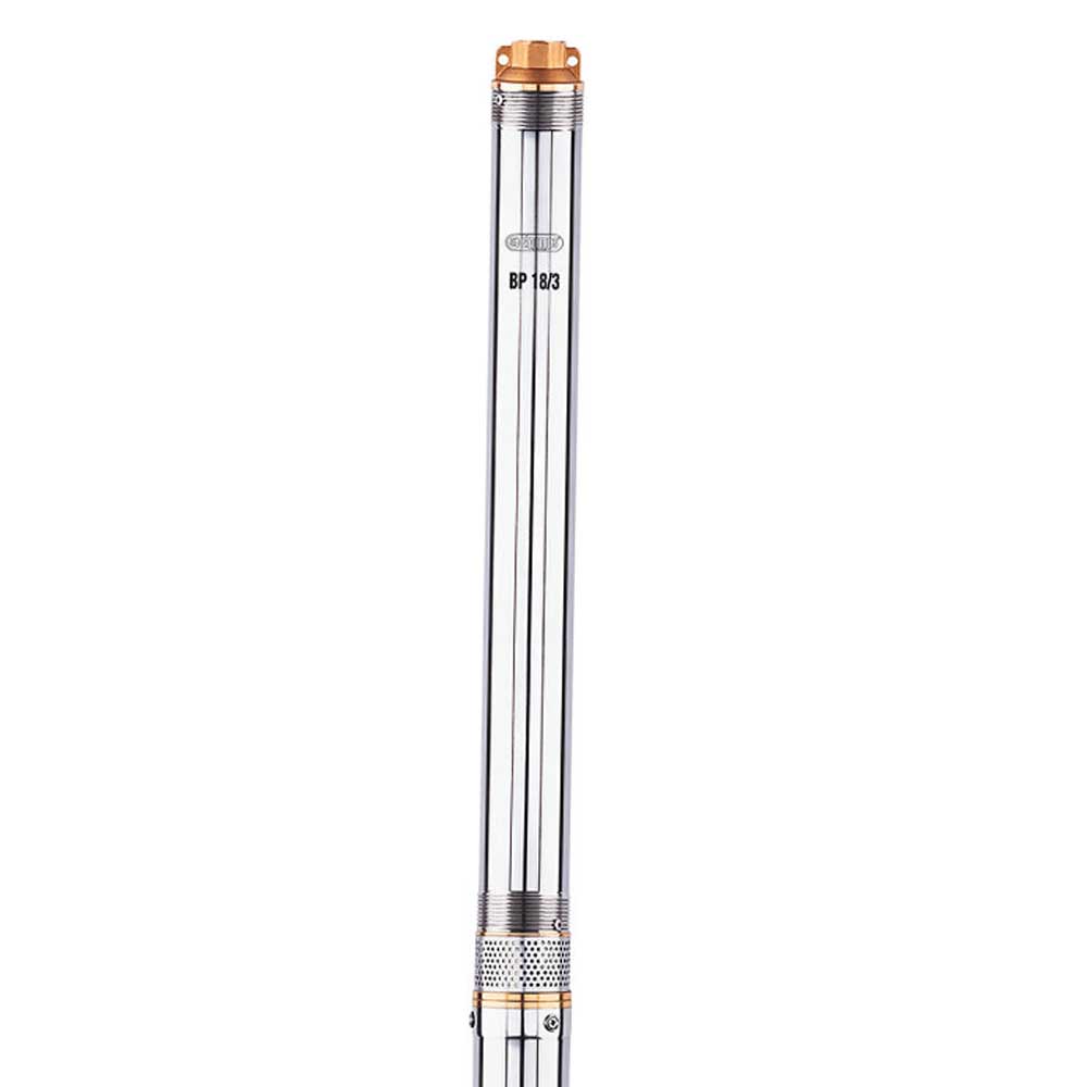 Корпус скважинного насоса Elpumps BP 18/3 выполнен из стали, не поддается коррозии и деформации. Устройство перекачивает чистую воду температурой до 35 °С с возможным содержанием песка не более 40 г/м3. Грязь и ил не попадают в насос благодаря забору воды из центральной части корпуса. Кабель длиной 20 м позволяет расположить насос в удобном месте без использования дополнительных приборов. Вес насоса – 13 кг.