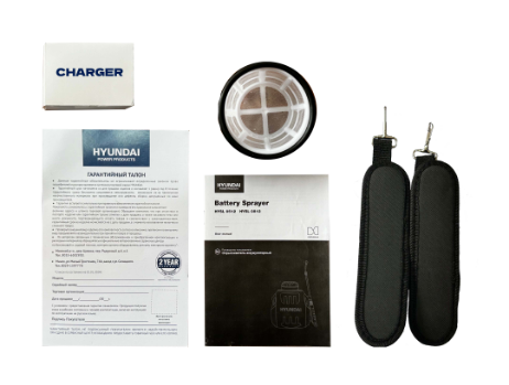 Опрыскиватель, ремень, зарядное устройство, водяной фильтр, инструкция, гарантийный талон.