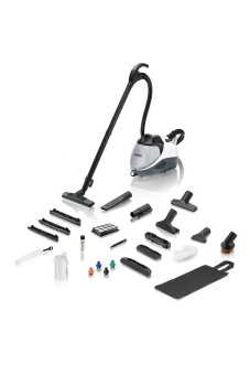 Паропылесос Karcher SV 7 Premium – премиальная модель, которая совмещает в себе функции пылесоса и пароочистителя с расширенным комплектов насадок. Подходит как для сухой, так и для влажной уборки, поэтому легко справится и с песком, и с разлитыми жидкостями и трудновыводимыми пятнами на кухне, в ванной и детской комнате. Инструмент имеет 2 бака для воды объемом 0,5 и 0,45 л, что позволяет убрать всю квартиру без перерывов.