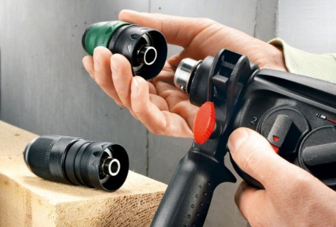 Комплектуется двумя патронами: SDS-plus для долбления и ударного сверления и быстрозажимным патроном для сверления.