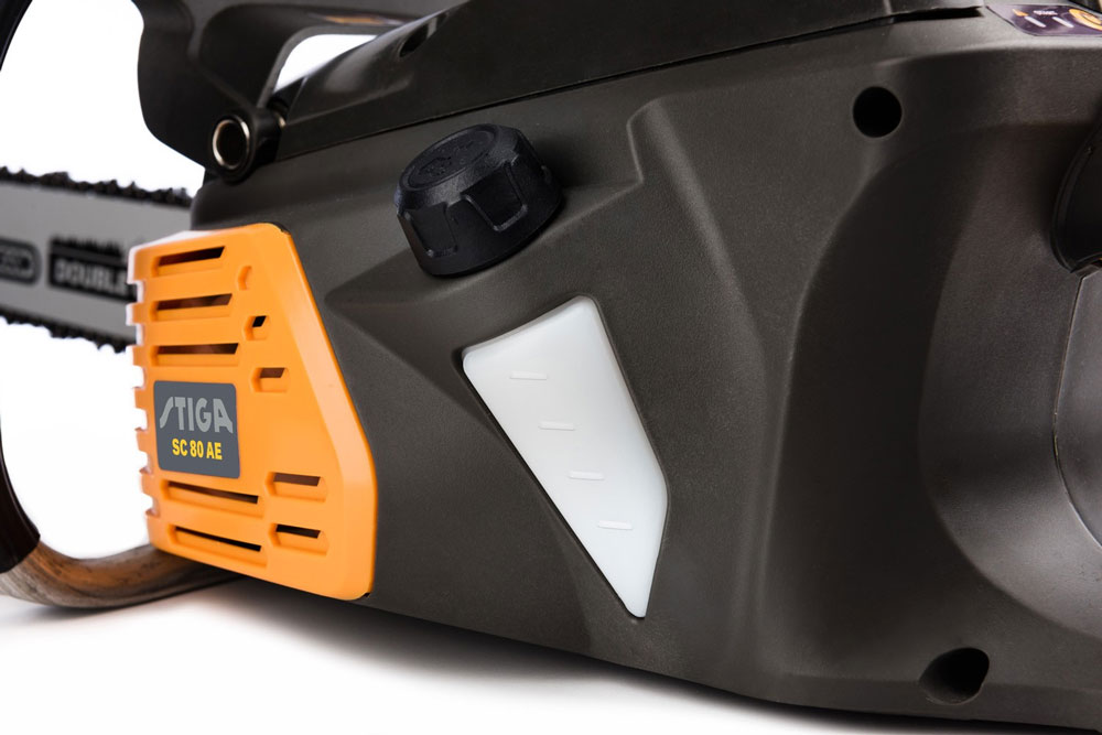 Аккумуляторная пила STIGA SC 80 AE комплектуется шиной длиной 40 см. Объем масляного бака составляет 20 мл. Бак имеет прозрачное окошко для постоянного контроля уровня масла и предотвращения работы без него. Смазка цепи осуществляется автоматически, что продлевает срок службы цепи и снижает расход масла.