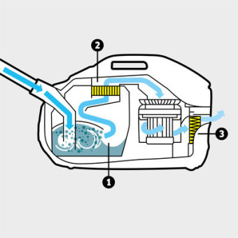 Всем, кто заботится о чистоте и свежем воздухе в доме, Karcher рекомендует использовать пылесос с аквафильтром DS 6 Premium Plus, гарантирующий не только тщательную уборку, но и поддержание здорового микроклимата. В отличие от обычных пылесосов, в которых используются фильтр-мешки, аппарат DS 6 Premium Plus реализует высокоэффективную технологию водной фильтрации. Всасываемый воздух проходит через водяной фильтр, создающий вихревые водяные потоки высокой скорости, благодаря чему грязь эффективно поглощается и задерживается водой. Результат - свежий и невероятно чистый воздух.