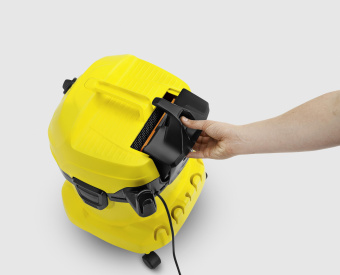 Karcher WD 4 оборудован большим мусоросборником объемом 20 л, который надежно удерживает пыль, песок и грязь. Длинный 5-метровый кабель позволяет выполнять работы в любых труднодоступных местах. На корпусе пылесоса предусмотрены специальные места для хранения аксессуаров, входящих в комплект поставки. Вес инструмента составляет 7,1 кг.