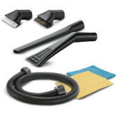 Комплектация: Всасывающий шланг, 2.2 м, пластмасса; Съемная антистатическая рукоятка, изогнутая; Удлинительные трубки, 2 шт., 0.5 м, 35 мм, пластмасса; Насадка для влажной и сухой уборки, переключаемая; Плоский складчатый фильтр, в съемной кассете; Фильтр-мешок из нетканого материала, 1 шт.; Адаптер для соединения с электроинструментами; Розетка с автоматикой включения / отключения; Регулировка мощности всасывания; Щелевая насадка; Прочный корпус; Поворотные ролики, 5 шт. -