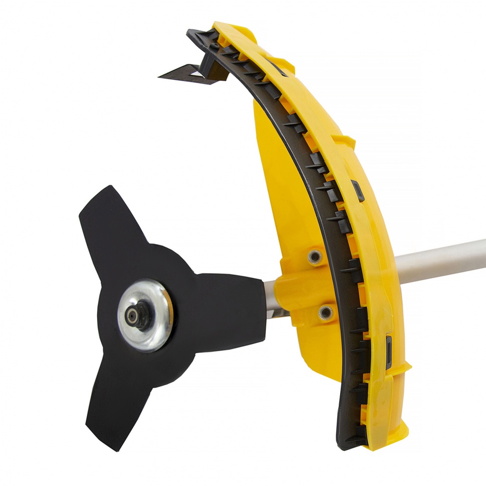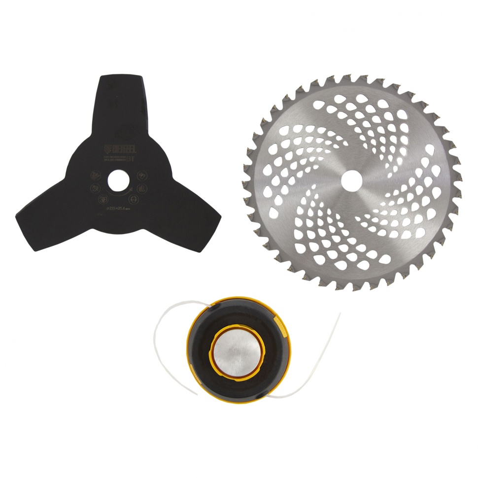 Он комплектуется сразу тремя режущими инструментами: леской с шириной скашивания 42 см, трехлопастным ножом и пильным диском с шириной скашивания 25,5 см.